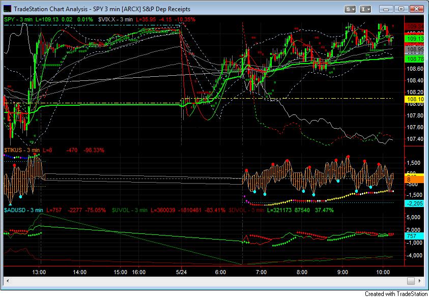 Markets are trying to grind higher as the VIX sees a mini-crush and indices challenge Friday’s highs. Internals are mixed, but mostly sloped higher even as up and down volume are matched, suggestive of a positively biased range trade overall. Don’t forget that a good part of Europe is on vacation today.