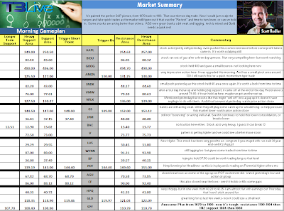 I sold the rest of my SPY yesterday and am trading very light now. If you want specific stock comments and price points, take a look at my price point sheet (provided as a free sample today and always available on T3Live.com).