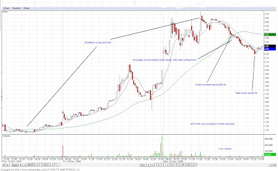 I was busy all morning, and finally did some PM paper trading into the market’s close. Man, there are often big swings at the end of the day. Today I was going solo and not taking advantage of the Investors Live chatroom. I am getting more adept at looking at a chart and spotting set-ups, reading the direction the stock is heading, etc. For example, I saw SFI breaking down after lunch but I couldn’t get shares to borrow. I also spotted EPIX on TD Ameritrade’s Motion Detector and was loaded up to buy at .58 on FDA news, but got spooked out. Closed at $1.10 today. So the execution of this analysis is what is lagging. Today, I made only made one paper trade. But I left lots of money on the table. I manually lifted my stop order to exit as I thought the stock was moving against me, so it turned into a -$10 loss, instead of a couple hundred profit if I had just been patient.