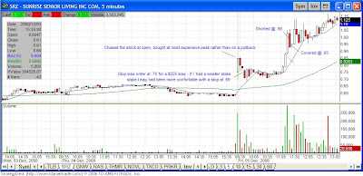 So I made two paper trades of the same stock today. I tried to long SRZ a couple weeks ago (I just re-read that post and I’m still struggling with some of the same stuff), so I was familiar with it and it was in my screener’s list of stocks. It was up significantly in early trading, and I made the cardinal mistake of chasing a stock. So I purchased it five minutes in at its peak at .84 – 2,500 shares, which means every penny movement is worth $25. This is great in a winning trade but makes you more fearful in a losing direction and I bailed out at .75 like 5 minutes later at a loss of $225. Paper loss but it still made me mad, largely if I don’t make any progress in virtual trading, I’m not going to put any more real money at stake. Later, I made a better call. Instade of chasing it when it spiked up .24 cents in like 15 minutes, it looked like it was stalling when it got over $1. Level II orders were in the .90’s and the bid spread was what Muddy call’s “jiggy” – bids were like 8 cents under the current price but asks were near the last sale. I figured the longs from the morning make take profit here, and the stock fell for a short bit. I was a little indecisive about it so my entry was a little late at .98, and I should of covered at .93, but it quickly went in the other direction, and I knew I had to get out as looked like it was going to pop again. This trade made $75 minus commissions.