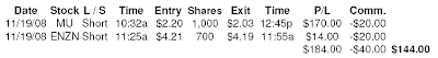 I spotted MU using TD Ameritrade’s Motion Detector, and when I looked it up on the five minute chart, it had the opposite of three candlestick soldiers but going down, a sharp drop from $2.50 at the open, so I got in at $2.20. Someone also mentioned MU in the InvestorsLive chatroom too. It touched $2, and I thought it would plummet if it got into the $1.90s, but it bounced off this support and it seemed like there were buyers interested so after a spike to almost $2.09, I got out at $2.03 and it closed at $2.11. This was a clear downtrending stock going for weeks on a weak overall market day. ENZN was the opposite, jumping up in the first hour of trading by 50 cents. It was identified as a long by Muddy and others in the chatroom and it crossed 10/60 SMA to support this view. I was thinking what goes up quick will come down just as fast, but decided to put in a tight stop. I got in at $4.21, and it got as low as $4.12 within a half hour after shorting, but my stop limit order was triggered at $4.19, which ended up being good as this spiked up to $4.40 though sinking to near $4 at the close. With commissions, this ended up being a slight loss and a losing trade.