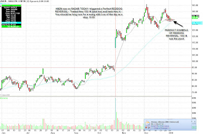 Lots of people ask “just what is a RedDog reversal?” Well today in Amazon (AMZN) we saw a textbook example of such a trade. The stock traded through yesterday’s low of $133.14, so any longs against that level got stopped out. Some shorts initiated positions there, looking for another down day (I call them the juice chasers), giving the stock an initial push lower.