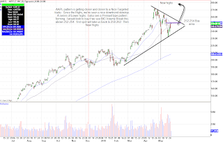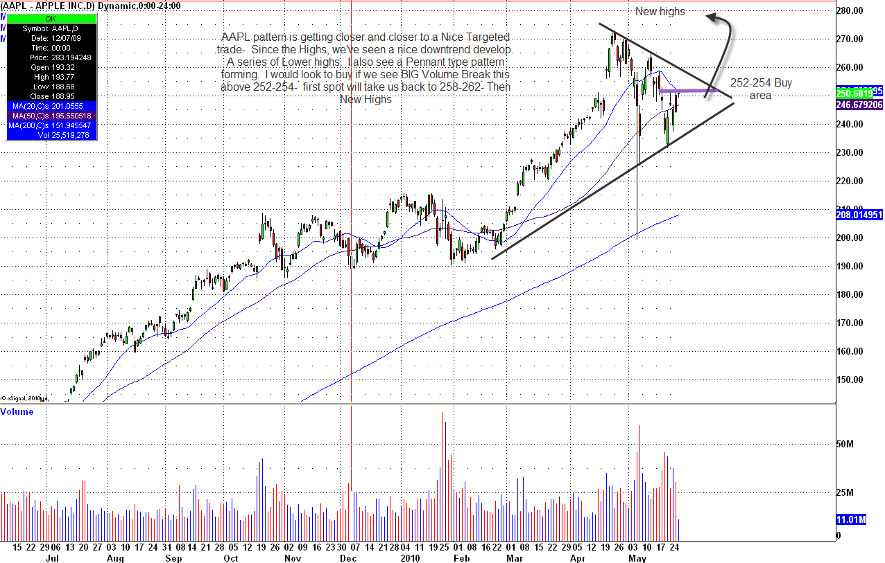 Right now, I see a series of lower highs that might be tested soon. Some of my go-to tech stocks are already making new move highs (SNDK, VMW) and AAPL should be next. If this market continues to bounce, I feel AAPL can be bought on a break of the downtrend in the 252-254 area for a quick momentum move to 258-262, then eventually new highs for the year. Put your stops in at 246 if we trigger.