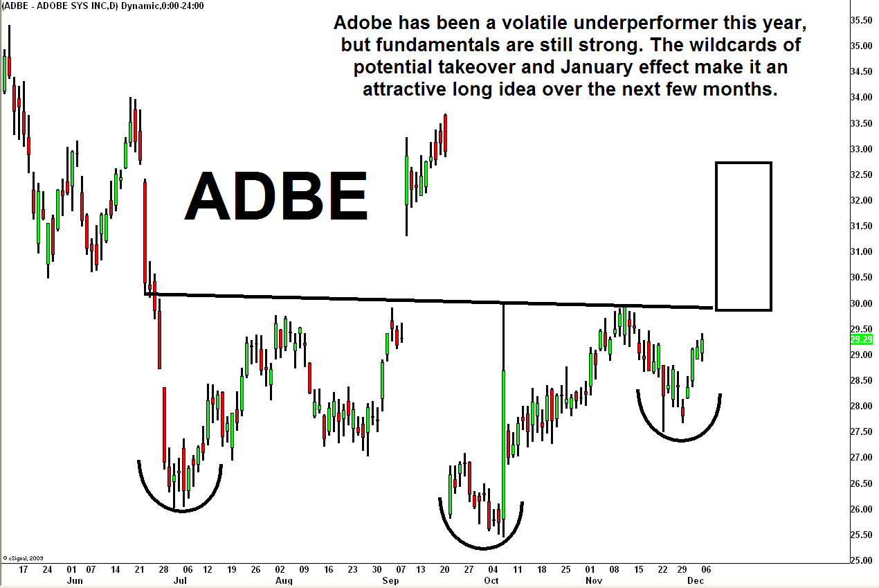 Most importantly for me, the chart looks good. Adobe has put in a higher low and looks headed for new move highs and a possible gap fill. Something else to keep in mind is the idea of the January effect. Since the stock has underpeformed the market and lost value this year, investors could opt to unload the stock to offset capital gains in other investments this year for tax purposes. Come January, with the tax-motivated selling out of the way, the stock could perk up considerably. In addition, the company remains a potential takeover target with Microsoft Corporation (Nasdaq:MSFT) often mentioned as the most interested party. Despite revising down guidance in its third quarter report (which sent the stock down more than 20% overnight), Adobe management is bullish on future growth prospects for the company and thus resistant to a potential takeover.