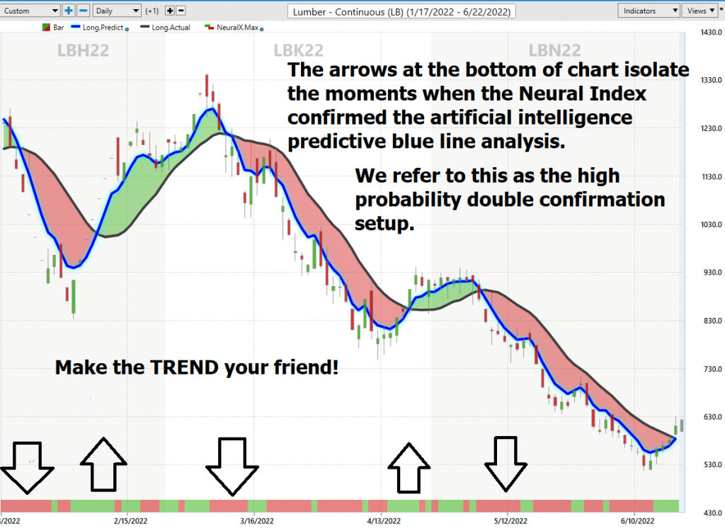 As you can see on the following chart there were 8 trends that the artificial intelligence forecasted on Lumber over the previous 9 months. The green numbers represent the gains or losses on the UP forecasts. The Red numbers represent the returns on the down forecasts.