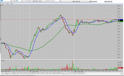 TUESDAY: I amended this post to put my trades up with some commentary. I really overtraded this day (17 transactions) and after getting behind, threw away all my rules and followed no logic – I basically decided I would try to scalp $5 profits in a fit of irrationality. What ended up happening was I stayed in bad trades too long and exited good ones way too early and missed the big moves. This day was a bullish trending day – though much of the bounce was in the first half hour; it continued rallying most of day but some equities faded in the afternoon. I missed a big opportunity here by overtrading – if I had simply longed FAS like I had the previous couple days (which where range bound) on this major trending day, I would of done fine. Here is a chart of TPX. I shorted on the red line. I exited for a five cent profit when I thought scalping would solve my problems. The result, I missed a half buck easy price move if I had been patient (this stock went steadily down – no pullups at all to spook shorts, I just didn’t want to wait).