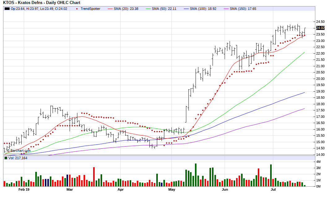 The Barchart Chart of the Day belongs to the national defense technology company Kratos Defense and Security Solutions (KTOS). I found the stock by sorting Barchart's 100 Top Stocks list first by the highest technical buy signals, then used the Flipchart feature to review the charts for consistent price appreciation. Since the Trend Spotter signaled a buy on 4/29 the stock gained 50.28%.