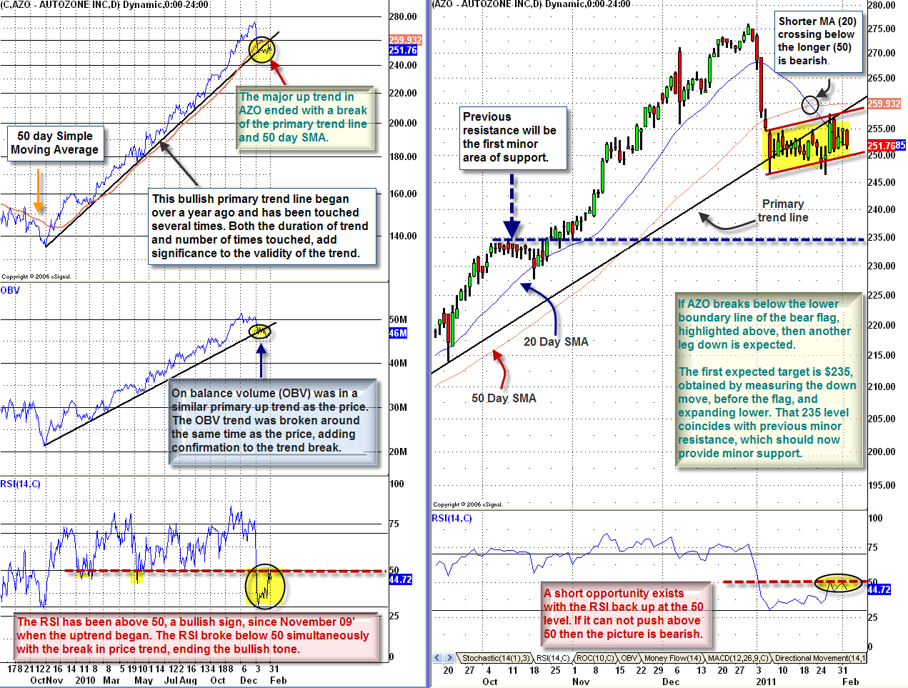 An end to the primary up trend in Autozone Inc. (AZO) was recently signaled by breaks in the 50 day simple moving average and the bullish primary trend line. Currently, the price is consolidating in a bear flag pattern. If the lower trendline of the flag is broken, a move to $235 is initially expected.