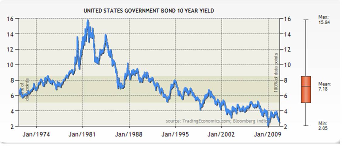 Investors with huge amounts of assets under management (e.g. pension funds, sovereign wealth funds etc.) are buying US government debt at an astonishing rate. As a result, the annual return one can expect on a US 10-year Treasury is around 2.5%! Keeping in mind that the US central bank attempts to keep inflation between 1% and 3%, the level of this fairly long-term issue appears rather unsustainable. Consider the yield of this bond over the last several decades: