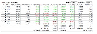 I had $500 in my Think or Swim account and a week ago, bought 100 shares of C at $.99. Over the weekend, I decided that I would take some small positions in other loser stocks, all at risk of being nationalized or going bankrupt or having reverse stock splits. My main criteria for buying was that they were cheap, which is a classic rookie mistake. I did a couple things right: 1) I bought them near their 52-week lows in a very oversold market; 2) I took very small positions (100 shares) and 3) Didn’t put all my money into one stock but nine of them (diversified).