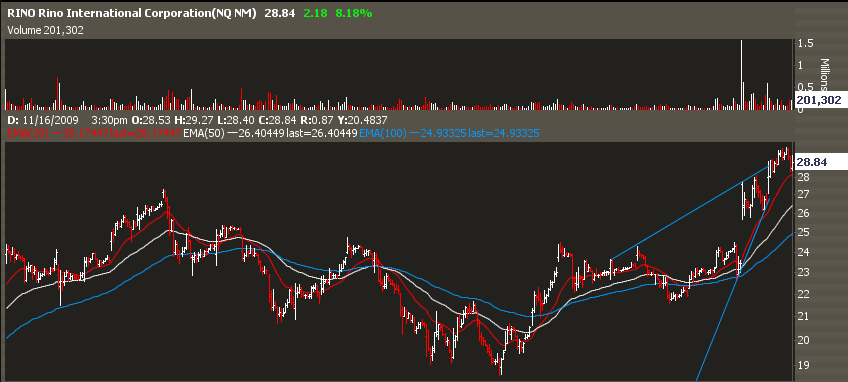 There are many stocks listed above which I seen appear many times on similar lists lately. In some of my previous breakout bull reports, I outlined an option strategy on both HMIN (see it here) and NTY (see it here). This list is also packed full of stocks I have been keeping an eye on and would like to own as I think they will trade higher. Out of the stocks listed above, I will write about RINO International (RINO), as I have watched it appear several times in the last month on my daily screen for these stocks. This stock exploded to the upside Friday after a great earnings release. Note that this stock closed 90 cents below its high for the day (also 52-week high) which could mean a reversal is in play, however it came off of the highs on light volume. I will look to be purchasing this stock if it can trade back up near a 52 week high on above average volume in the near future. With the help of the market I believe this stock will continue much higher. The December option contracts on RINO also traded much higher than the daily average Monday. I believe it will be worth describing a detailed option play I am interested in below. Note that many of the stocks listed above will be good plays and many will be bad plays, I list them all to show possible breakout stocks and write about a few of the ones I am interested in. (Click chart to enlarge).