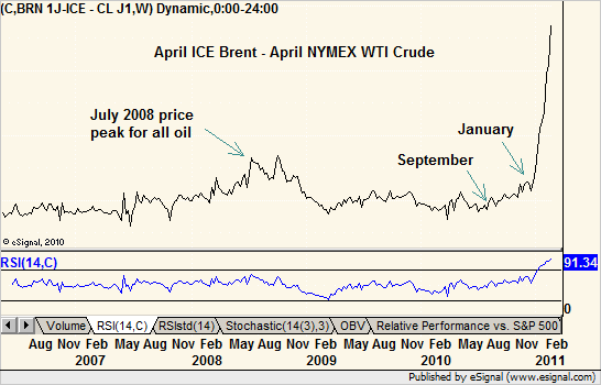 Uncategorized Brent vs. WTI Feb 23, 2011 I’d love it if a reader can tell me what this means. Before the last oil run up the spread widened but this time it is insane.