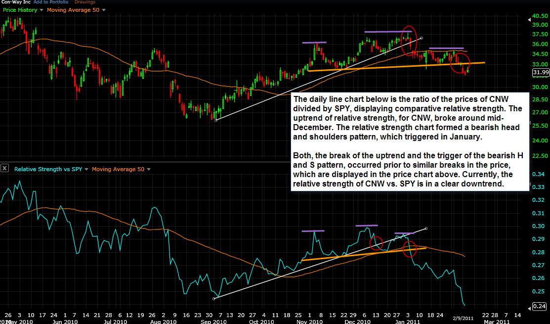 Chart 2: Illustrates the break of the uptrend in comparative relative strength of CNW versus SPY.