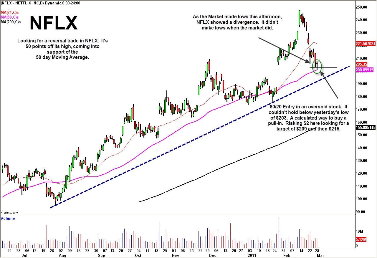 There were two things that made us confident about yesterday as a potential buying opportunity in NFLX, and the stock has not run overnight so it’s still at a good potential area. First, the stock bounced yesterday exactly off its 50-day moving average. Second, the reversal (a move down through the previous day’s low and then back above it) presents a defined risk-reward parameter. You can enter the stock on that reversal and put stops at the low of that day with targets back at the nearest resistance level, which currently stands around $215.