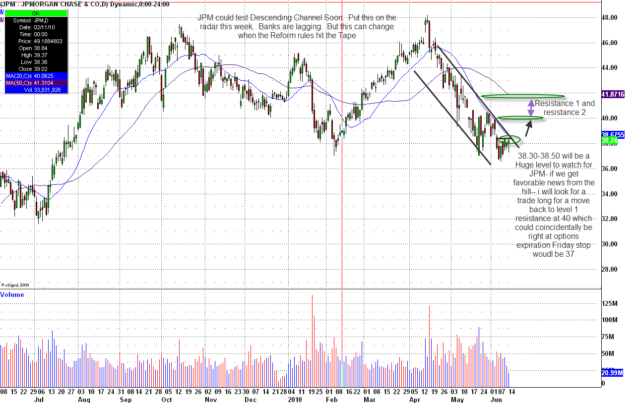 Our buy area is 38.30-38.50 on big volume, which could take us to 40ish very quickly just in time for options expiration on Friday. Resistance level two would be around 41.75-42.25. We will focus on being in size for this quick momentum type move, but if market conditions continue to improve JP Morgan could represent a tremendous value for a long-term buy in this area.