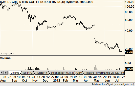 But when stocks break that kind of size, they are indeed broken, not on sale. Just look at Green Mountain Coffee (and its P/E was not in the 50s before the break).