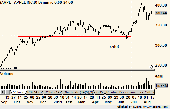 Take a look at a stock on sale. Apple sold off and broke support in 2011 only to recover instantly. Note the day of the low, in candlesticks, was a hammer, too.