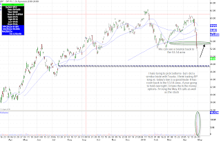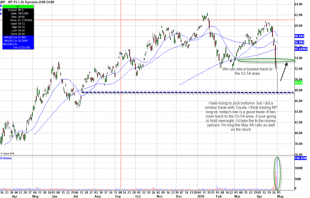 While we never try to pick bottoms, I feel its worth the risk to take a shot at BP in this area. I think we saw some capitulation today, and I bought BP at 48.60. Since I haven’t been caught in the downdraft I feel more comfortable looking to take advantage of this adversity. I will trade it long vs. today’s low.