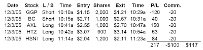 I went short on GGP and BC when they looked weak in the morning after run-ups yesterday or today. However, right around then the DOW started to head up, and it was good I got out both as these as they ended up going up $.30 each quickly. AXL did a nice 10/60 SMA cross continuing up from yesterday’s close, and I got in at $1.55, which was a little late for a stock on the top of my watch list – $1.45 would of been better if I had been paying attention. I did exit properly at $1.70 as that has been resistance lately, and it went down from there. HTZ spiked at the same time, and Tort/Adam in chat gave an alert and I got in at $3.07 (after it broke the magical $1 threshold). This one I had trouble selling and getting my order filled, and I got out $.05 less than than $1.19, where I wanted to exit. HSNI was a Muddy alert in chat. It went down quickly and bounced off $2.00 but there wasn’t alot of other signs this was going to go up, especially for getting in at $2.04 rather than at like $1.90. The exit order on this one also didn’t get filled as I wanted and was nearly a dime less than my first sell order. Here is the chart on AXL: