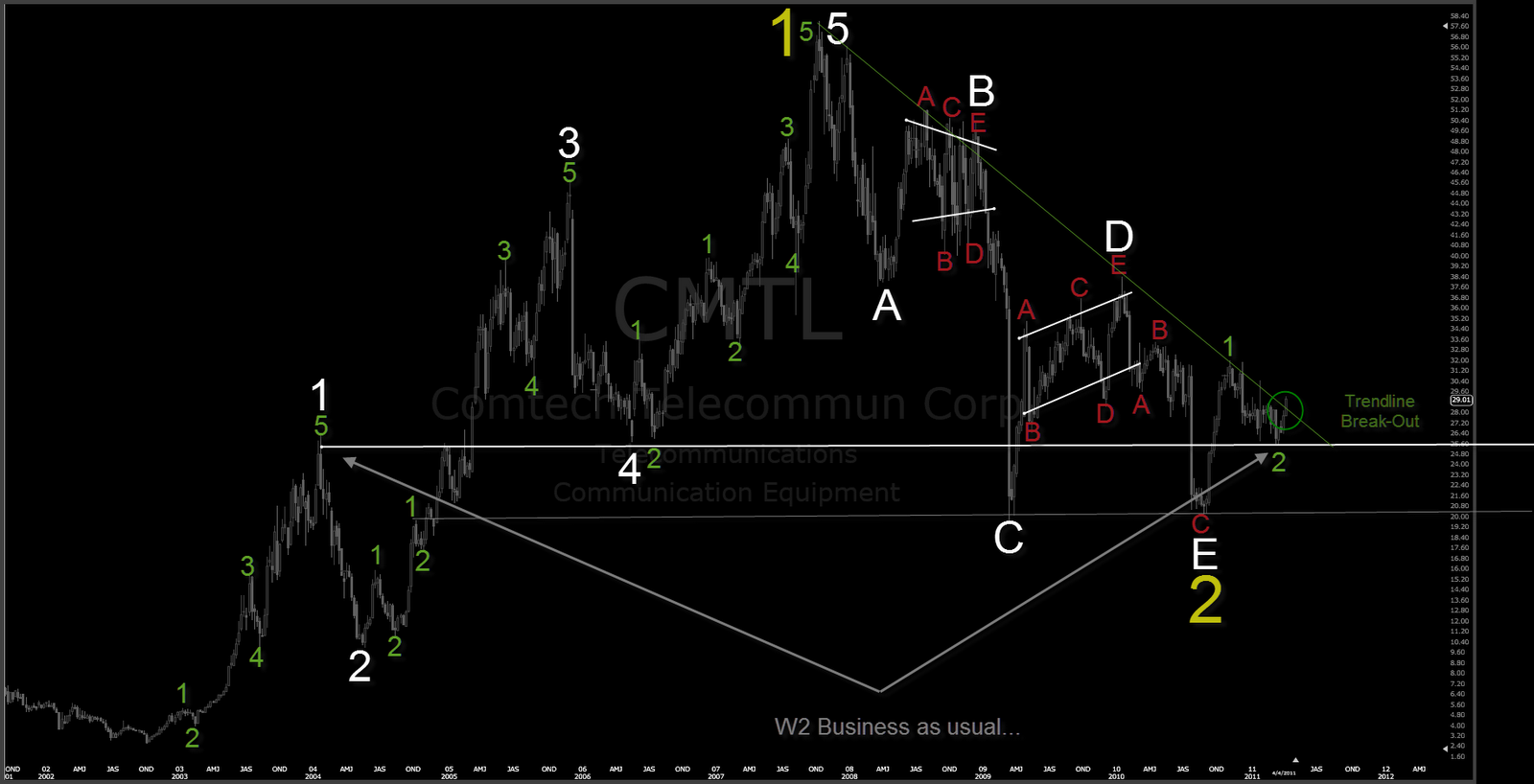 Stocks Comtech Telecommunication, CMTL Apr 7, 2011 Slightly updated, potential upper trendline channel break-out confirmed. Counts are the same. Looking good.