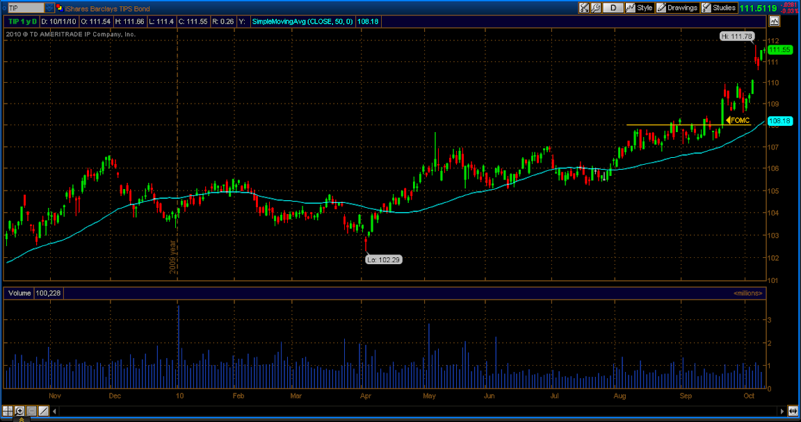 The break-even rate between TIPS and 30-year bonds reached 2.29% on October 6th, an indication of higher inflation expectations (Bloomberg). TIPS, Treasury Inflation Protected Securities, are a closely watched indicator by the FOMC. Bernanke watches markets and often reacts to their demands. But, through his use of language he is quietly achieving his goal of supporting asset prices and building in inflation expectations. There is no need for more QE if the market itself creates the outcome just by knowing the Fed is willing to fight for said outcome, inflating assets. This is good and should allow the Fed to do nothing.