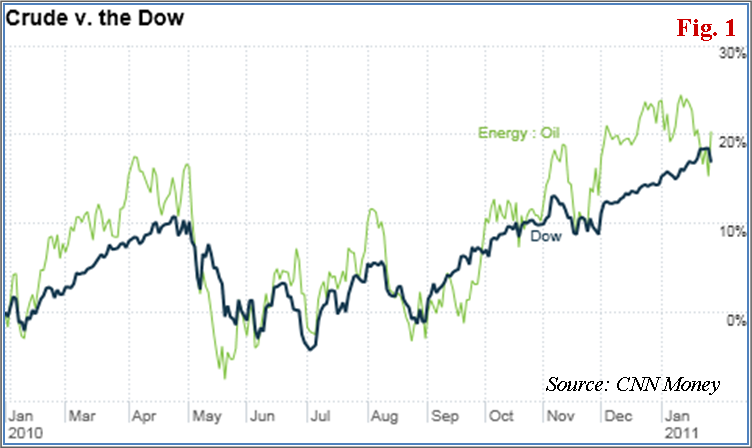 Crude oil and equities were mostly trending in tandem since the 2008 financial crisis on the prospect of global economic recovery. And geopolitical event tends to spur a broad market risk-off trade, i.e. selling off of equities and commodities like crude, going into bonds and dollar. However, since the situation in Egypt is very specific to the supply risk of crude oil, this time around, it is risk-off for stocks, but risk-on for crude, resulting in a divergence. (Fig. 1)