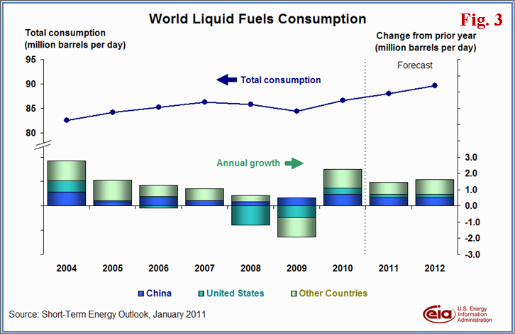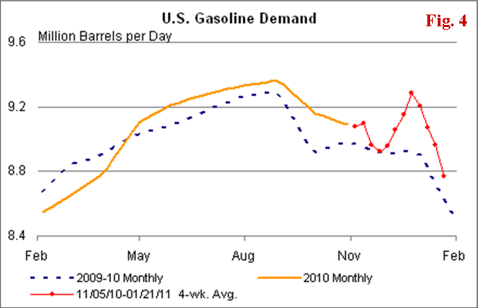 The North African turmoil also strengthened North Sea Brent Crude and widened its premium over WTI to a record $12.49 before ending the day at $10.08 (Fig. 2). Historically, WTI, a lighter and sweeter crude, has enjoyed a roughly $2 premium to the North Sean Brent.