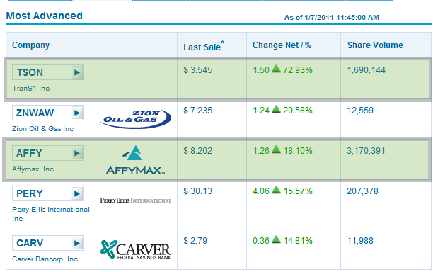 Stocks Decent Friday Jan 7, 2011 Have 2 now in the top 5 list, my AFFY chart appeared to be there also. Same business; Drugs & HealthCare & Medical That´s a small minus day in the index market.