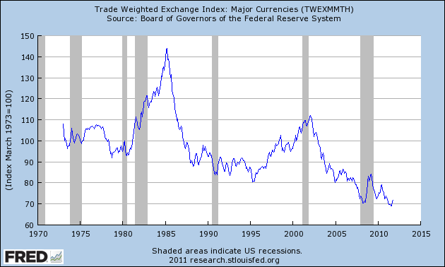 As the debt continues to grow, the value of the dollar continues to decline. Here is the chart of the value of the U. S. dollar against other major currencies over the last ten years.