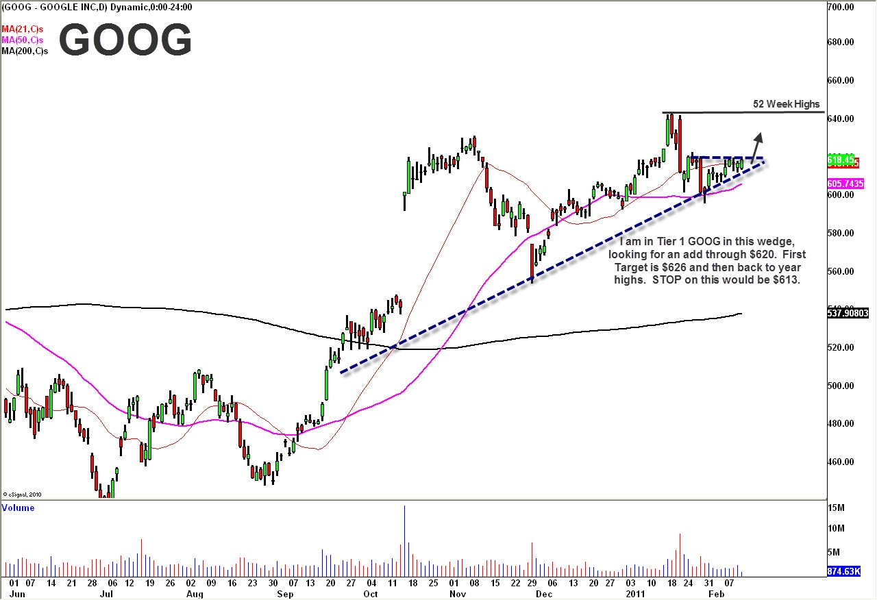 GOOG has been basing since earnings and now the pattern is getting tight. I would be in tier one around here, and will look to add if it ignites through $620. The first move is $624-626 for cash flow, and then will look to hold smaller core for new highs at some point this year. Stop would be $613.