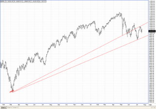 Currently we are at a key point. Dueling Trend lines, if you will. The trend line drawn from the March 09 low to the early July low around 9600, looms below a rough estimate has the intersection to be close to the 9800 level, depending on which day you are looking for the potential intersection point. We could very easily flush down to that 9800 level. Very easily. Especially if its a low volume day and the pros can get their programs to run the tables to the down side.