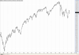 Taking a look at some charts late tonight. The Dow Jones Cash looks like its poised to take a Summer Dump down to the 9600 level. Basic Technical analysis confirms that the intermediate (3 to 6 months) trend is lower. We have had lower major lows and lower major highs for the past 3 months. Its funny how people discounted the “fat finger” 1000 point mini crash, or however we are characterizing that one day 1000 point spike lower in the Dow. The market digested its significance, and then basically discounted its low. The market has been telling us since then that we ought to be selling rallies. Down side target for the Dow? It would have to be 9800 and then 9600.