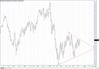 Why? Because we are in a 3 months sideways to lower trend already. Bearish symmetrical triangles, like the one defined by the two trend lines in crude, suggest crude may be poised for a price adjustment lower.