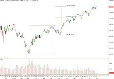 The concept of symmetry plays a large part in technical trading. Distances traveled tend to be equidistant in length, especially when in a corrective wave structure as is evident in the DOW. Today the DOW hit the symmetrical price target of 10,505 before turning down intraday. We need to keep a close watch as this falls into the areas of confluence resistance that we brought to your attention in our November 23rd post.