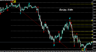 It seems it was not so bad idea to buy this bottom, we have actually rally coming for monday not only based for this chart but also some longer term charts. I will attatch some another charts & calculation should confirm the story later during the weekend for this same post including UsdJpy, but at so far one fully impulses ended. I believe this is A wave of upcming C downwave (structure of first A broke allready for ABC marked by yellow labels as you can spot from my earlier EurJpy charts), but very much same alternate guidelines steps to the arena again. Market will consider this as II corrective wave for upside impulse. Waves just progress so quickly, I thought originally todays bear setup would be monday issue.