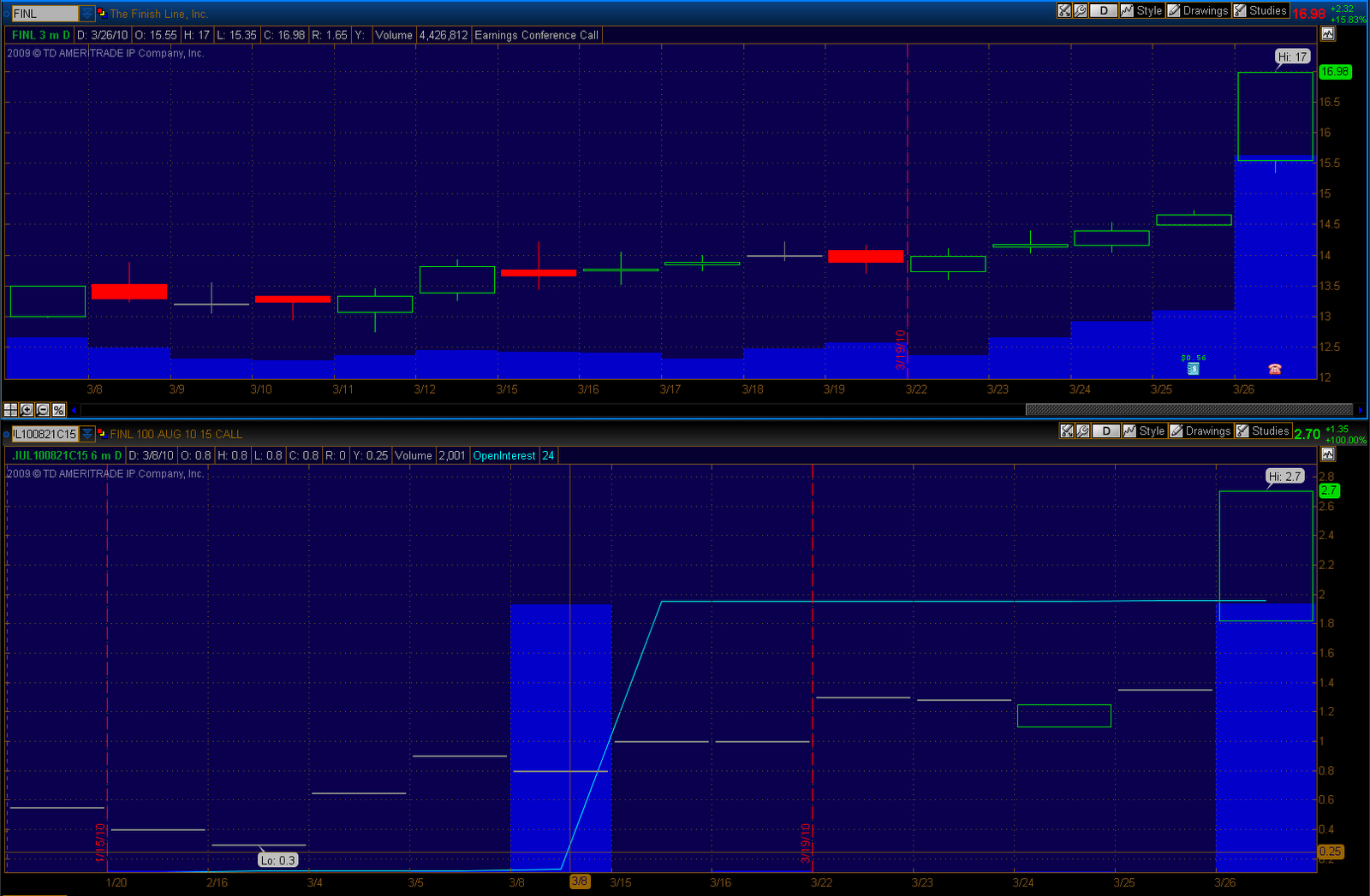 We can see on March 8 that 2,001 FINL August 2010 $15 call options traded on an open interest of just 24! 2,000 of these contracts traded all at once going for the ask price of $80 per contract. Again this option activity signaled “someone knows something volume” and I would have sent an alert out as soon as I noticed this. In the three weeks following this very bullish option trade, we can see that shares of FINL increased by 27.77% and these call options have increased by over 330%! You can also see on March 26 that 2,008 of these contracts traded on open interest of 2,030. High volume again, however contracts were being closed. This would have been my signal to take profits or roll the contract to a different strike price.