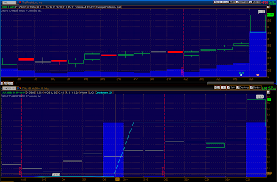We can see on February 25 that 5,106 HSNI June 2010 $30 call options traded on an open interest of just 6! Over 5,000 of these contracts traded all at once going for the ask price of $70 per contract. This option activity struck me as “someone knows something volume” therefore I followed the money and purchased these calls. In the month following this very bullish option trade, we can see that shares of HSNI increased by 38.97% and these call options have increased by over 470%!