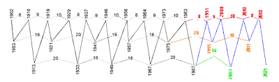 The coming bull market ideally lasts through to April-May 2010, then a short bear market starts until inflation is getting so high that everything (bonds excluded) begins to rise. The Benner-Fibonacci cycle aligns perfectly, since 1919 the highs and lows were all hits within a window of +/- some months, with just a single exception in 1964 (N=20):