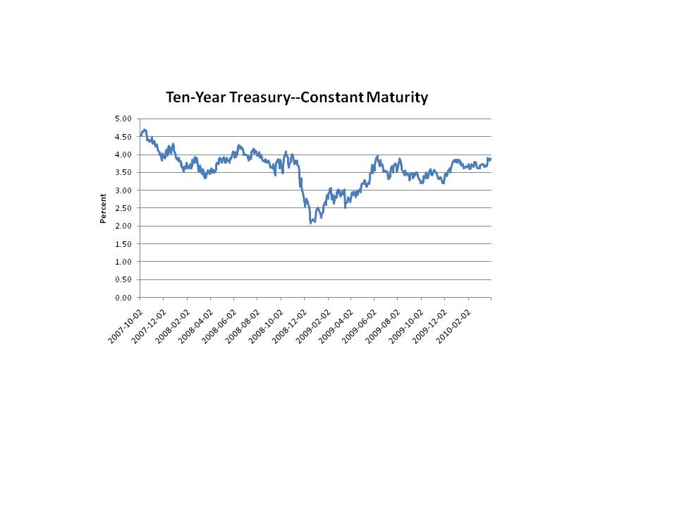 The ten year Treasury yield hit 4.00% yesterday, a level not hit since June 6, 2009. Then one has to go back to October 31, 2008 for the next time this yield hit the 4.00% level. The big question is, of course, where is the rate going to go from here?