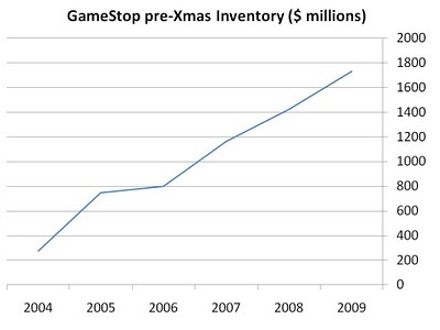 When we discussed GameStop’s (GME) same-store sales last week, a reader pointed out that GameStop appeared to have a burgeoning inventory problem. Indeed, looking at the pre-Christmas inventory levels of GameStop over the last few years shows a disturbing trend: