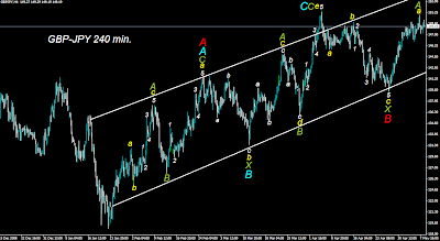 There we go, my first GBP-JPY EW chart. This is huge, 240 min channel while my Eur-Usd count I track is 60 Min. I didn´t end up with bearish wedge with it, because I thought it´s far too danger to take any wedge approach from the bottom as they are most often only A wave diagonals which are not so well documented & researched and tends to overthrow very strongly with C waves.