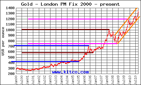 Looking at gold chart from year 2000 until now, we can see couple of rises in gold price.