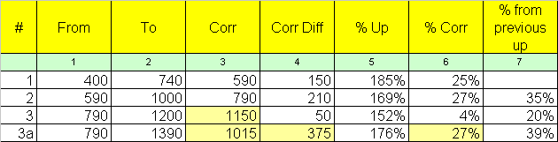 [row 3] We believed that the third rise was from 790 to 1200 (152%) and corrected back to 1150 (4%).