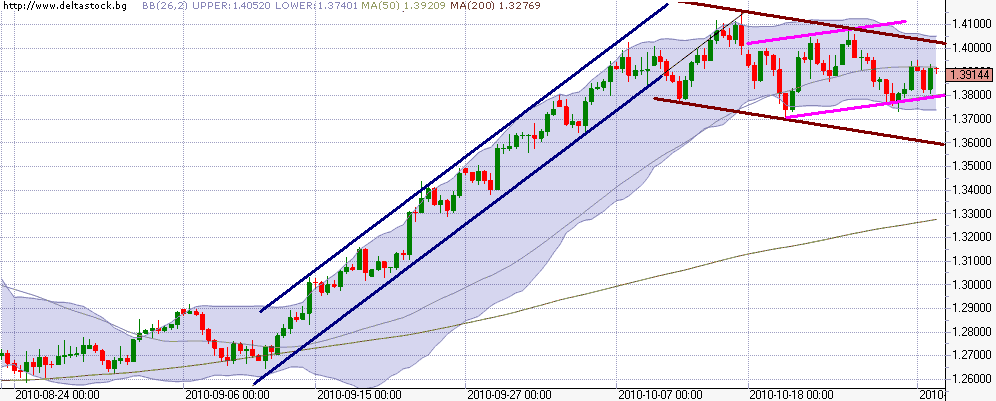 EUR lagging, it is not at the top of the channel, even more – the downtrend is very well seen (brown). We also could see the uptrend channel inside the downtrend channel (pink). This could be very well a triangle.