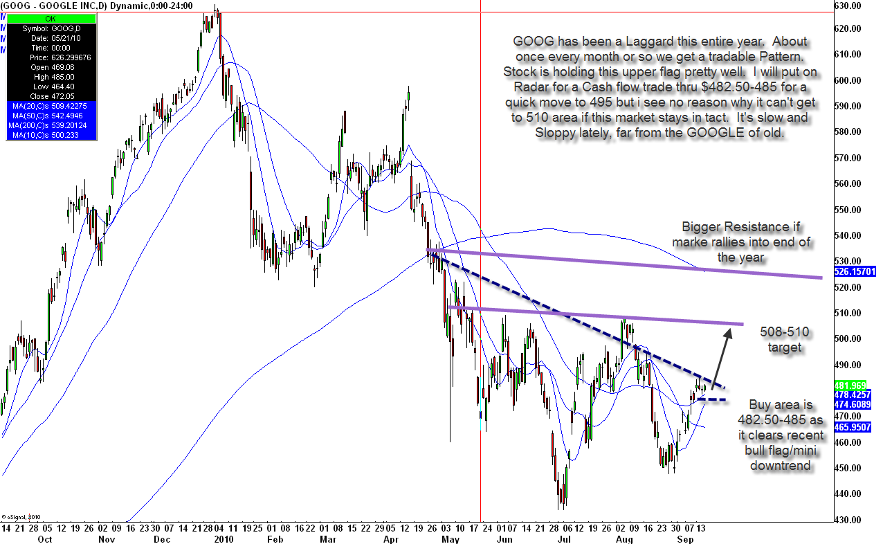 Google (NASDAQ: GOOG) has been a laggard this entire year and I’ve had it as an avoid, but every month or so I see a potential “cash flow” trading pattern. Right now many fundamental guys are starting to turn more positive and I see a decent tradable pattern in it.