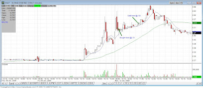 I did have something sneak up on me, maybe worse than fear – boredom. I saw GSAT spiking big in the morning, and instead of buying at the first peak of the morning, I entered at what looked like a pullback at .51, once again better than buying at top of the spike. Also, instead of taking out 2000 shares at this price, I entered with only 1,000 – and even paper trading, this was less stressful. While I was patient for about an hour and half as it crept up a couple pennies, I just got tired of waiting. I even had a trailing stop so that even if it sank back down, I would break even. So after manually ignoring my stop and closing it out, of course it rose to high of day to .66. Ended up with a $30 profit minus commissions. This is silly because there was no reason not to just let it be, with the trailing stop there, but mentally, I wanted to have a clean plate when I transitioned to work mode. This one was NOT a technically ideal set up as there was no crosses, jigginess, volume, news, etc., other than it was looking to hold up over the key half buck threshold.