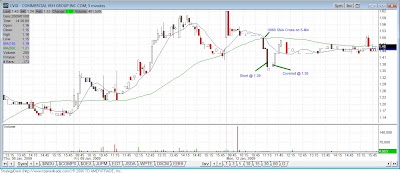 CVGI appeared to be breaking down as the entire market was clearly in a daily down tread. On this one, there was a 10/60 SMA cross on the 5-min chart, with a clear drop. But it bounced off $1.35 and basically traded sideways the rest of the day. I put in a tight trailing stop on this one too, as my other position on GSAT was still open, and this stop got me out preventing a loss. When this stop was triggered, it was part of the reason I just wanted to clear the decks and I impulsively got out of GSAT too soon after. This was a $10 profit but after a $15 commission was a $5 loss. So I ended up $10 for the day with the pesky commissions factored in.