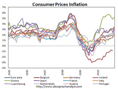The two which stand out here were Greece, with high inflation, and Ireland, which is still in deflation. Greece is a surprise to me as the debt crisis and austerity hit the country. Eurostat forecasts showed that Greece economy would have contracted 4.2% in real term in 2010, so the prospect of having economic contraction with an oddly high inflation (at 5.2% in December 2010) is extremely worrying.