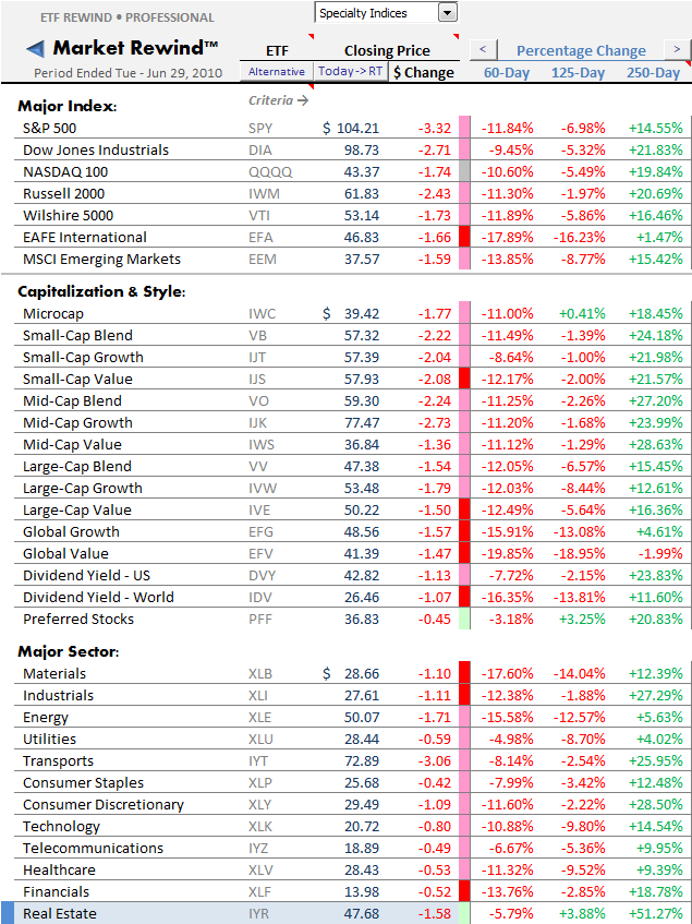 H1 2010 — Is it a virus, or the first half stock market performance on the year? Here is a small slice from ETF Rewind showing percentage changes for major indices, caps, styles and sectors during the last three, six and twelve month periods.