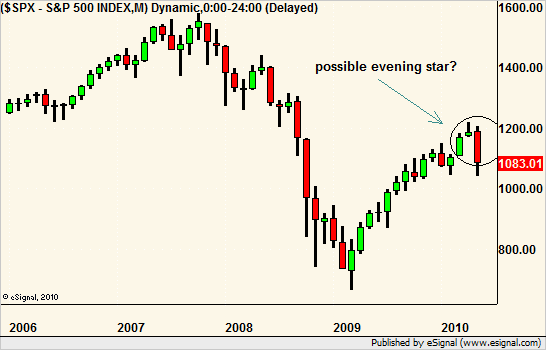 This is a monthly chart of the S&P 500. It may not be quite textbook but that is a possible evening star pattern and as its name suggests, the sun is setting on the market. Only a major rally over the next two days (to end the month) would negate that view.